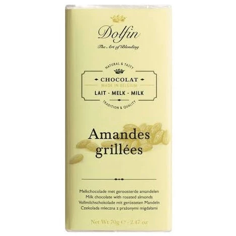 Belgian milk chocolate bar with roasted almonds (amandes grillées). Made in Belgium with natural ingredients.