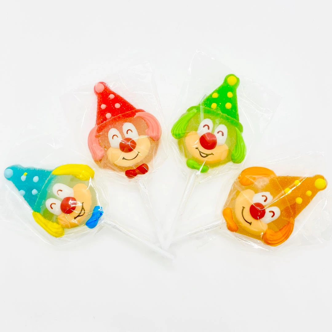 A jelly gummy lollipop in the shape of a Clown face. 23g