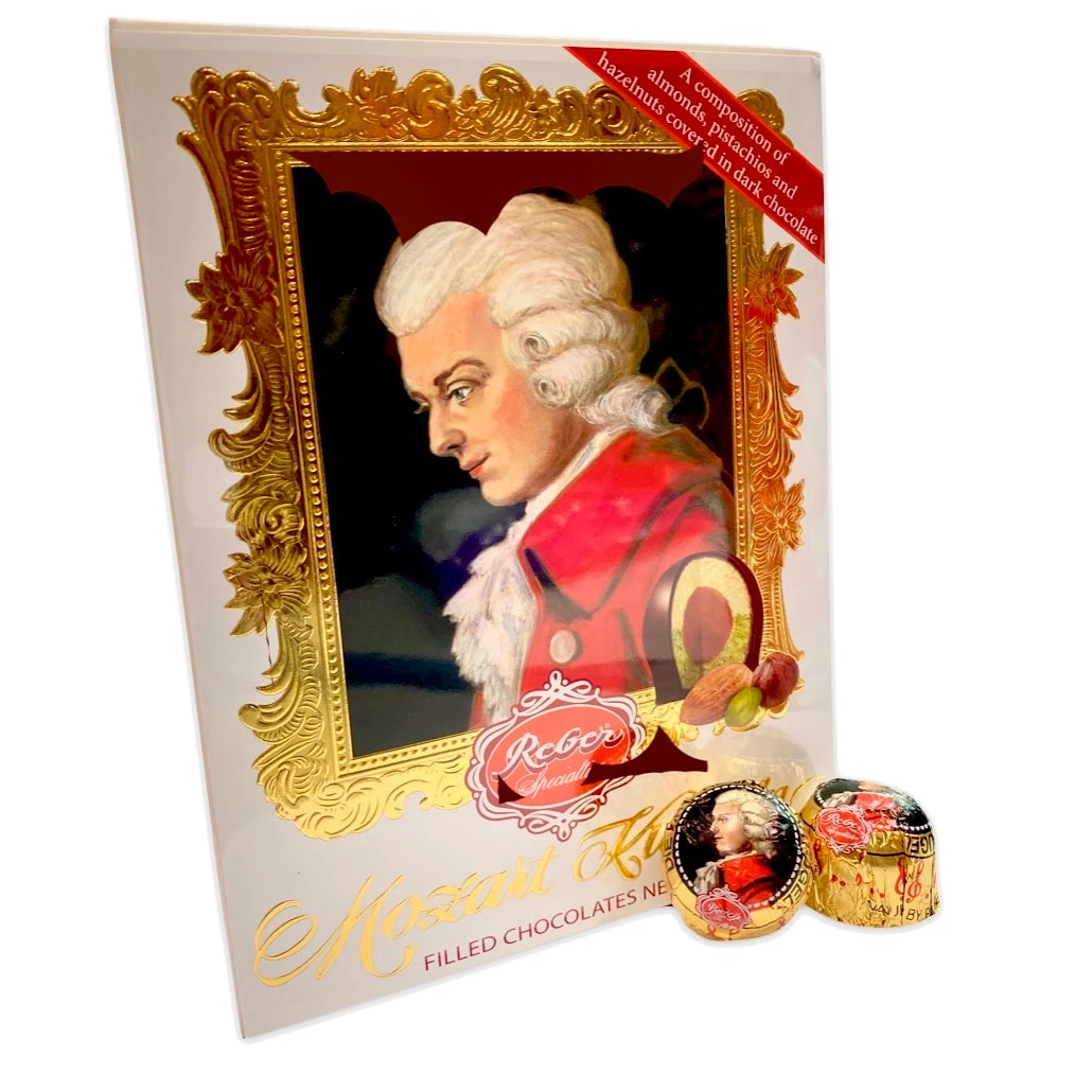 A Mozart kugel (Mozart ball), is renownedĀ confection made of pistachio marzipan, almond marzipan and hazelnut pralineĀ enrobed with a layer of alpine milk chocolate and finest dark chocolate.Ā This delicious treat is a symphony of flavour in one bite, oneĀ Mozart himself would take delight in! Now in a beautiful 240hĀ gift box (Approx 12pcs)!
