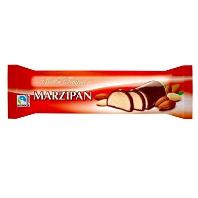 Fine dark chocolate covering one of the worlds best marzipans – German Maitre Truffout Marzipan Bar Covered in Dark Chocolate. Made with the finest dark chocolate and almond marzipan.