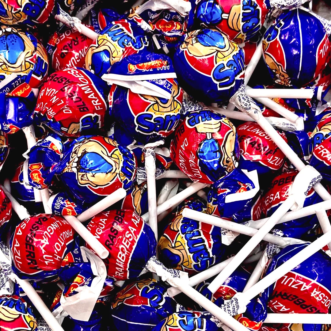 Blue raspberry flavoured tongue painter lollipops with a bubblegum centre