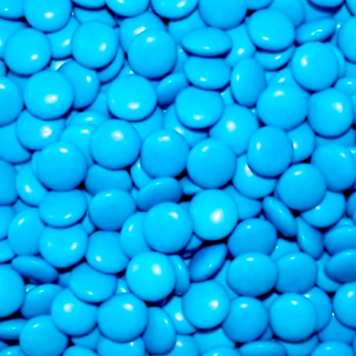 Milk chocolate centered buttons coated in a blue candy shell. Halal