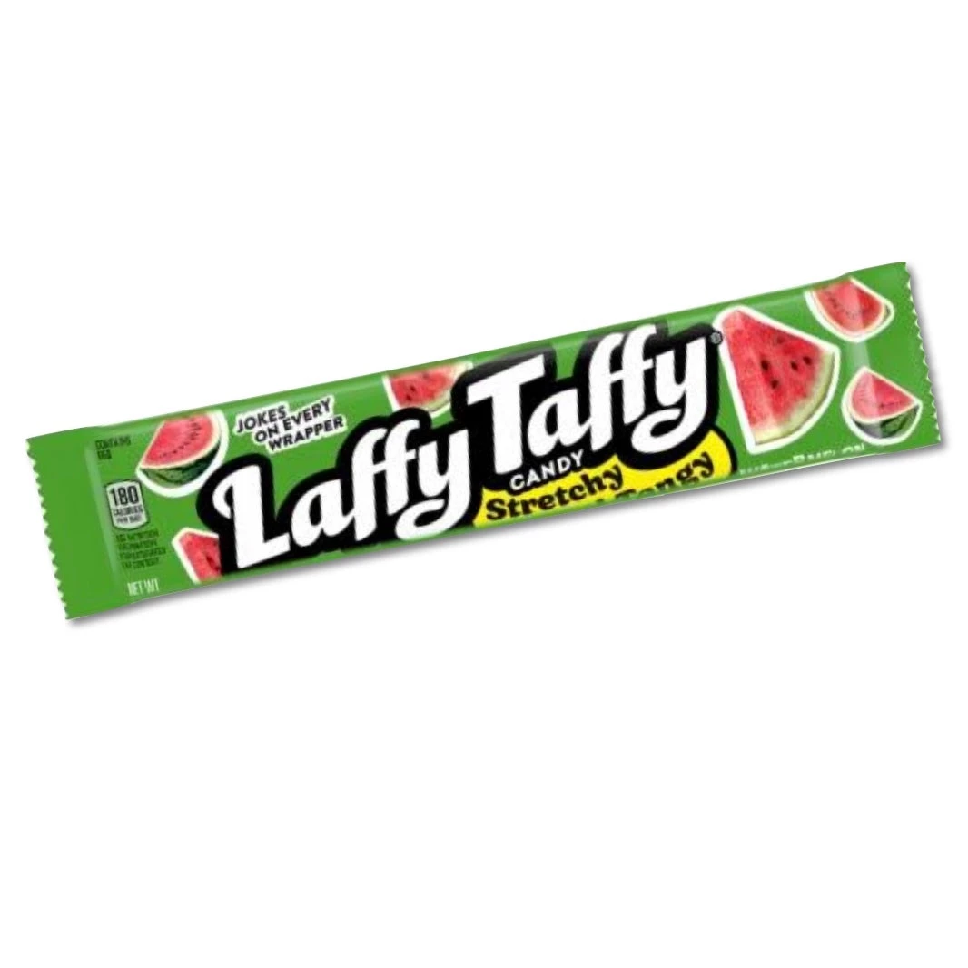 Watermelon, Cherry, Grape & Strawberry flavoured stretchy, chewy & tangy taffy. Jokes on every wrapper, which will make you laffy while you enjoy your taffy!