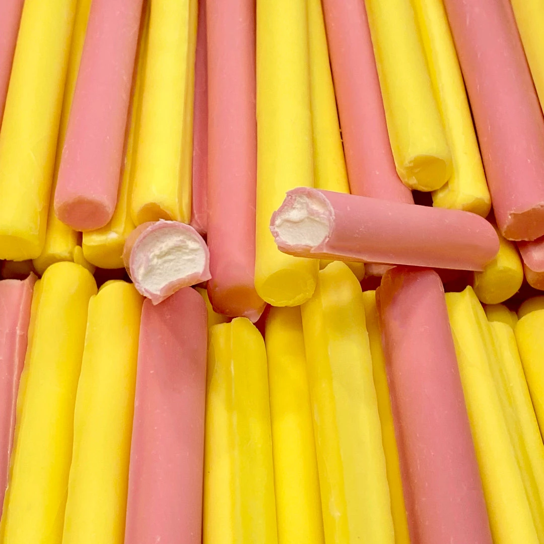 Strawberry & vanilla flavoured white chocolate coated marshmallow fingers. 5 units