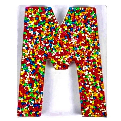 Novelty Milk chocolate freckle letter topped with sprinkles. Made In Australia