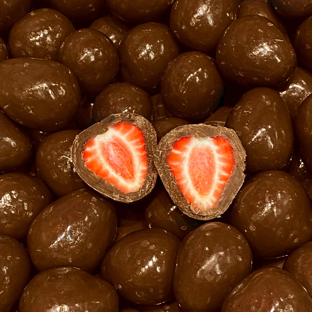 Milk Chocolate coated freeze dried strawberries. These have a texture similar to honeycomb while embodying the full fresh flavour of strawberry. Generously enrobed in delicious milk chocolate.