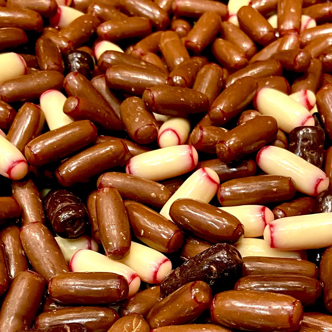 DARK BULLETS – Ingredients: Licorice (65%) [Wheat Flour, Molasses, Cane Sugar, Vegetable Fat, Colour (150c), Licorice Extract (1%), Emulsifier (471), Flavour, Preservative (200)]. Ingredients: Dark Chocolate (35%) [Cane Sugar, Cocoa Mass, Cocoa Butter, Emulsifiers (Soy Lecithin, 476), Milk Solids, Flavour, Glazing Agents (553, 904,1400)].