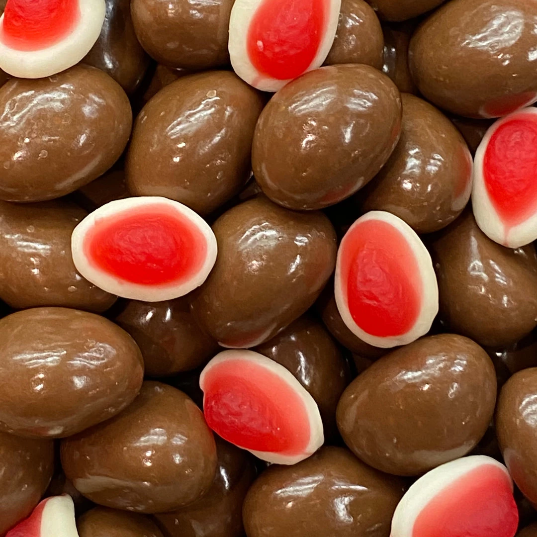Strawberry & Cream lollies enrobed in premium milk chocolate. Made in Australia.
