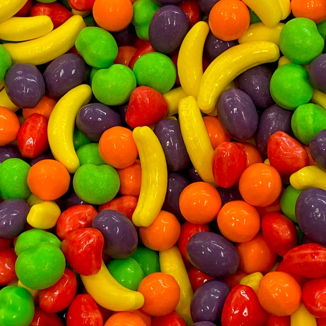 Ingredients: Dextrose, maltodextrin, and less than 2% of malic acid, calcium stearate, corn syrup, carnauba wax, natural flavors, color added, carmine color, blue1, blue 1 lake, blue 2 lake, red 40 lake, yellow 5, yellow 5 lake, yellow 6.