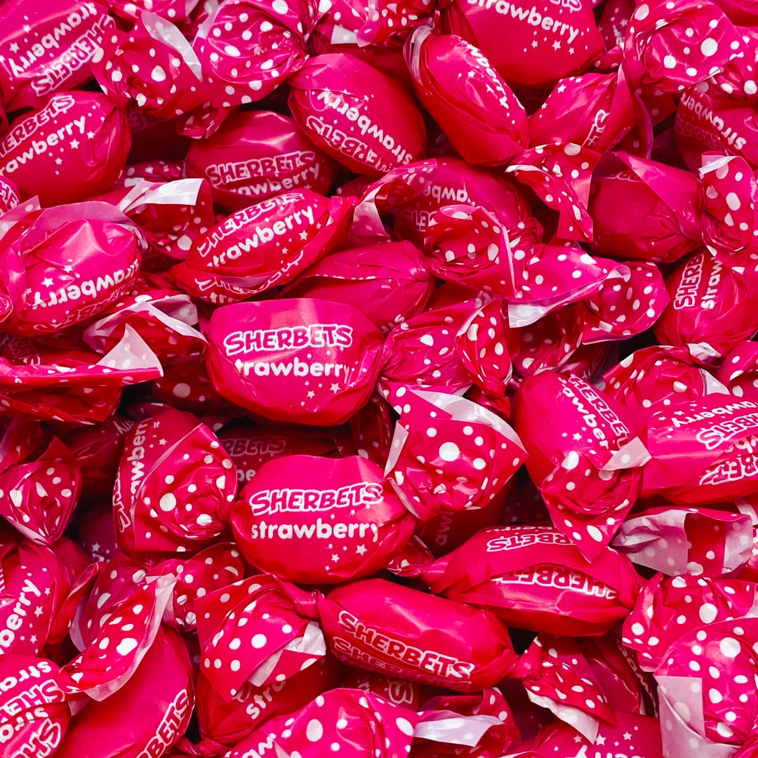 Pink strawberry flavoured hard lollies with a sherbet core, wrapped in a pink wrapper.