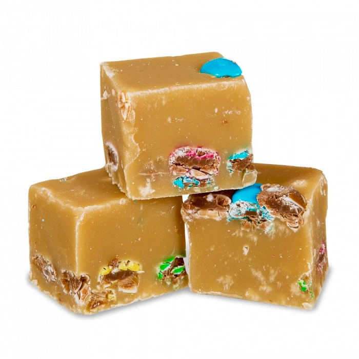 Smarties embedded in vanilla flavoured fudge pieces. Handcrafted in UK.