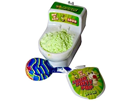 Sour Potty Pops are a dip n lick Strawberry & Apple sour sherbet lollipop. Novelty toilet with sherbet & lollipop