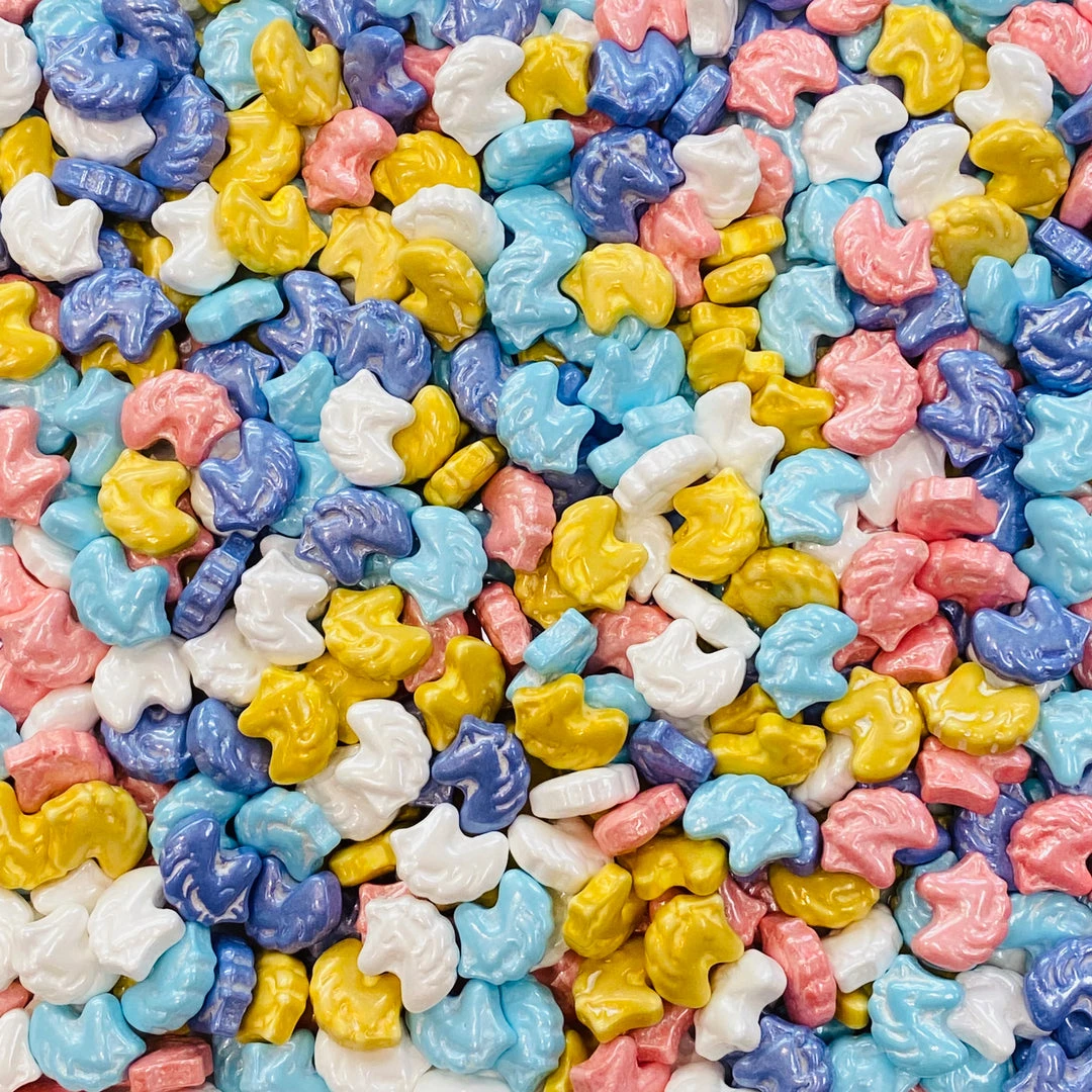 Shiny pearl pastel hard pressed candies in the shape of magical unicorns. Perfect for themed parties and cake decorating!