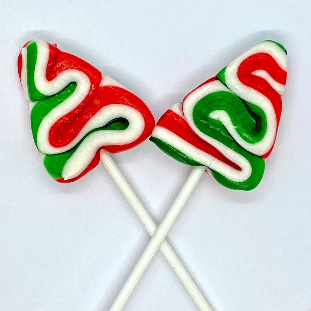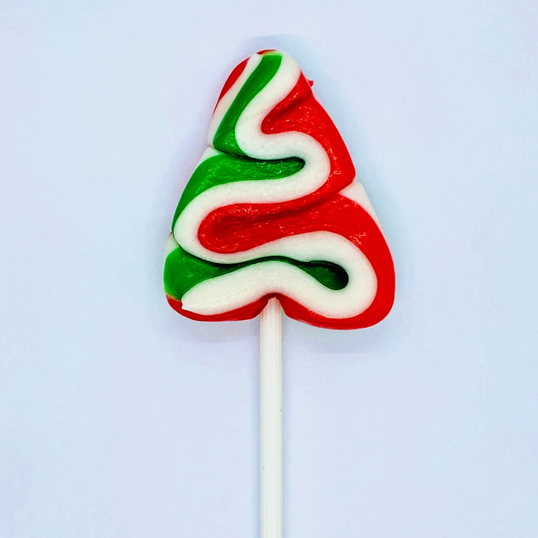 Traditionally handmade, raspberry-flavoured lollipop in the shape of a red, white & green Christmas/Xmas tree. A perfectly sweet addition to any Christmas gift.