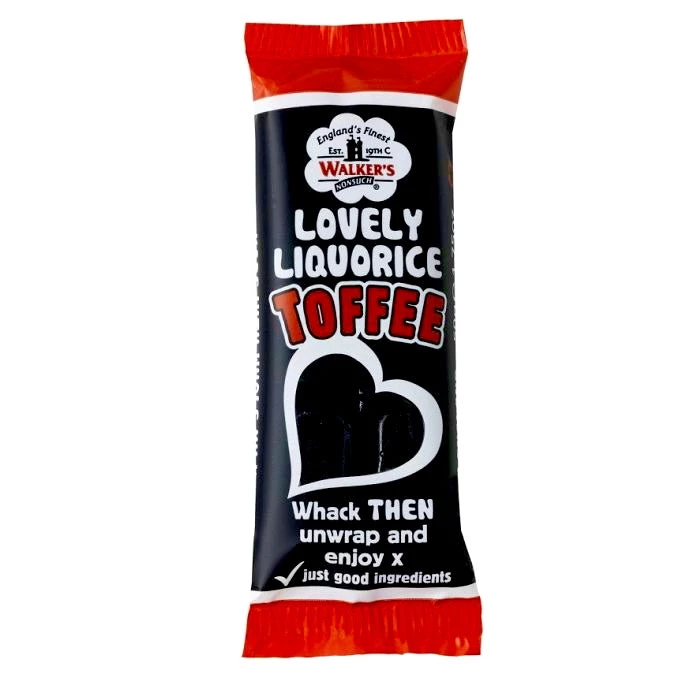 UK TRADITIONAL LIQUORICE TOFFEE Ingredients: glucose syrup, sugar, sweetened condensed milk (whole milk, sugar) 21%, vegetable oil (Sustainable palm, palm kernel), black treacle 5%, natural color, (vegetable carbon), licorice extract (0.7%, salt, emulsifiers (glycerol monostearate, soya lecithin), Oil of aniseed. Not suitable for sufferers of milk, nuts and soy allergies.